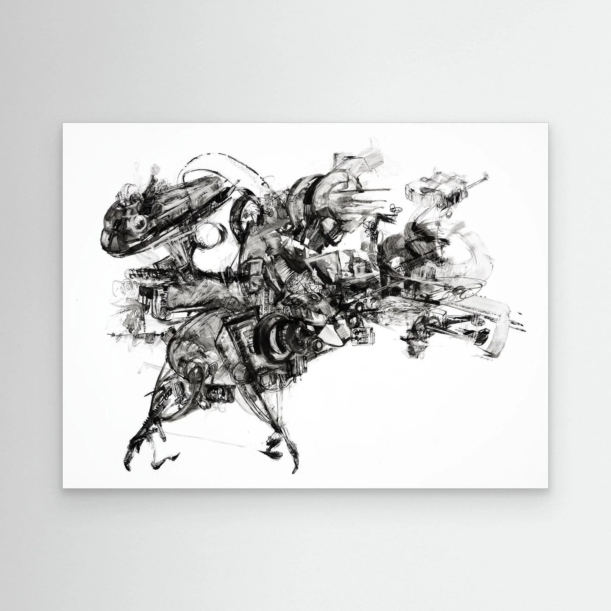 Internal Protection Machine, 2023, Ink and White Charcoal on Yupo — 11 x 14"